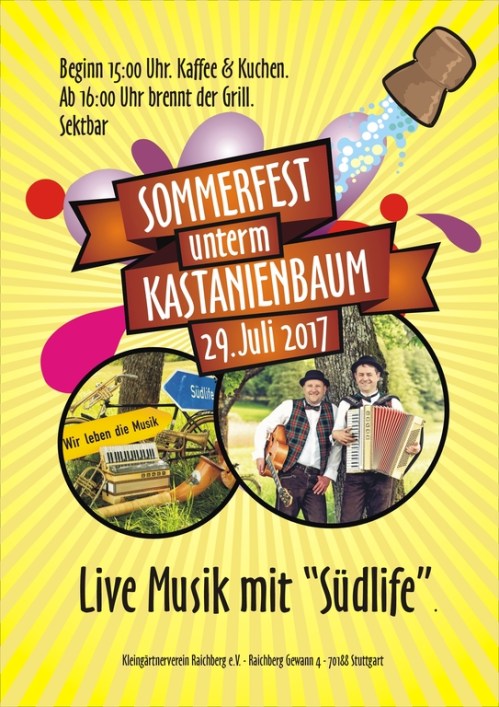 Am Samstag, 14.07., feiert der Kleingärtnerverein Raichberg unter dem Kastanienbaum. Beginn ist um 15:00 Uhr mit Kaffee und Kuchen, ab 16:00 Uhr brennt der Grill.